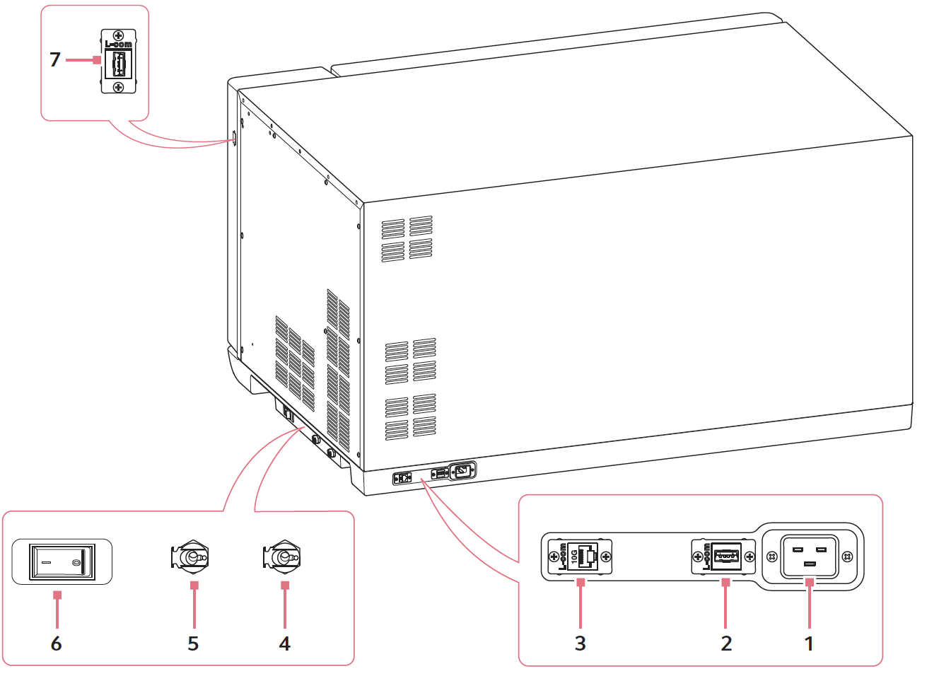 - Connect the Element-D to the Eppendorf Innova S44i via the ethernet cable to one of the ethernet ports. The location of the ethernet ports are 2 and 7 in the figure below.