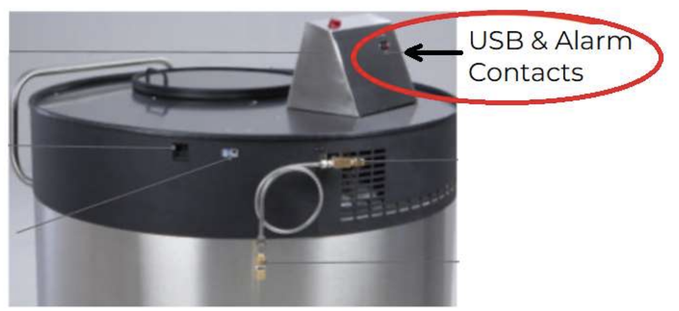Figure 1: Location of USB and Alarm Contact on top of Abeyance Cryo Freezer